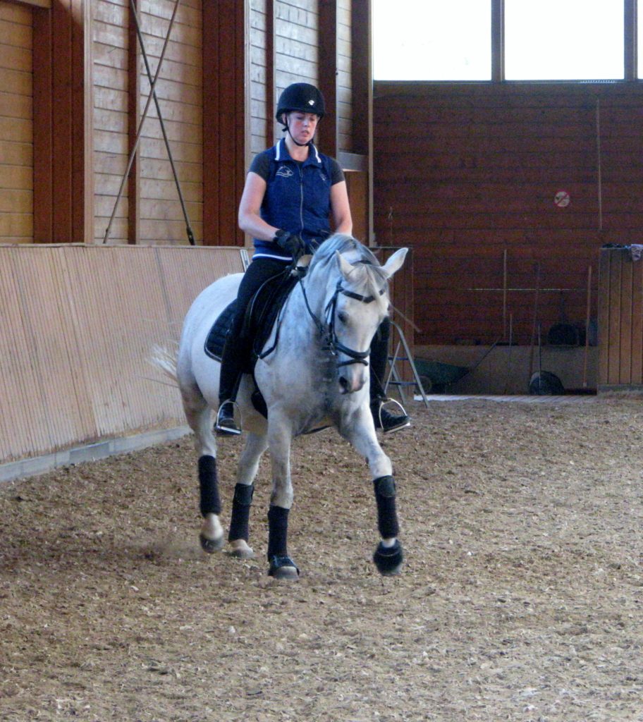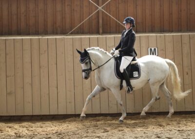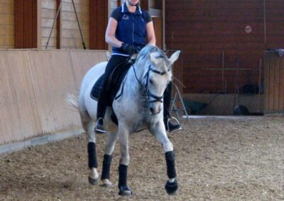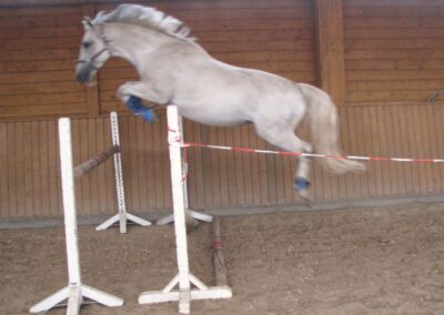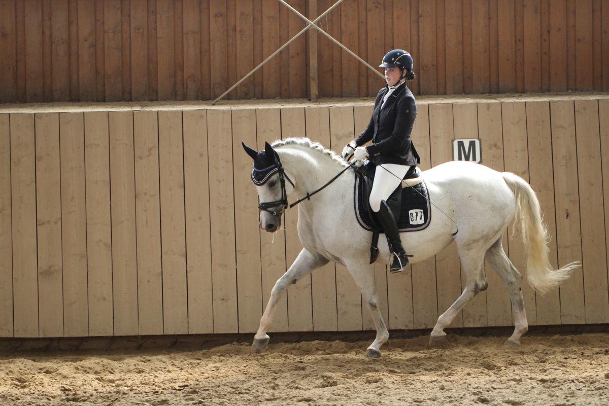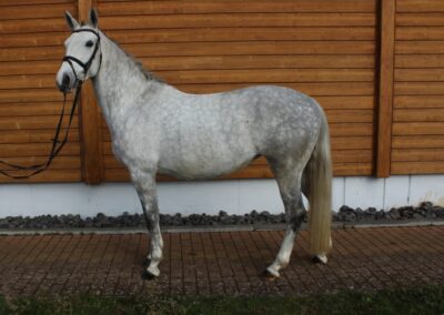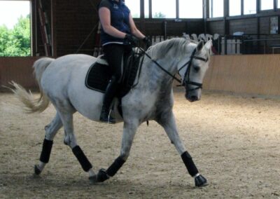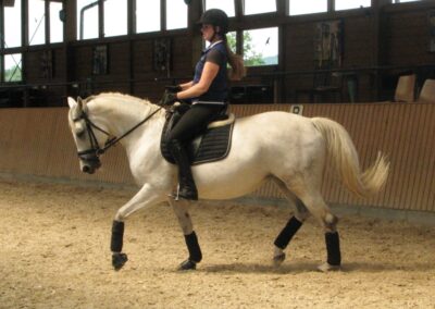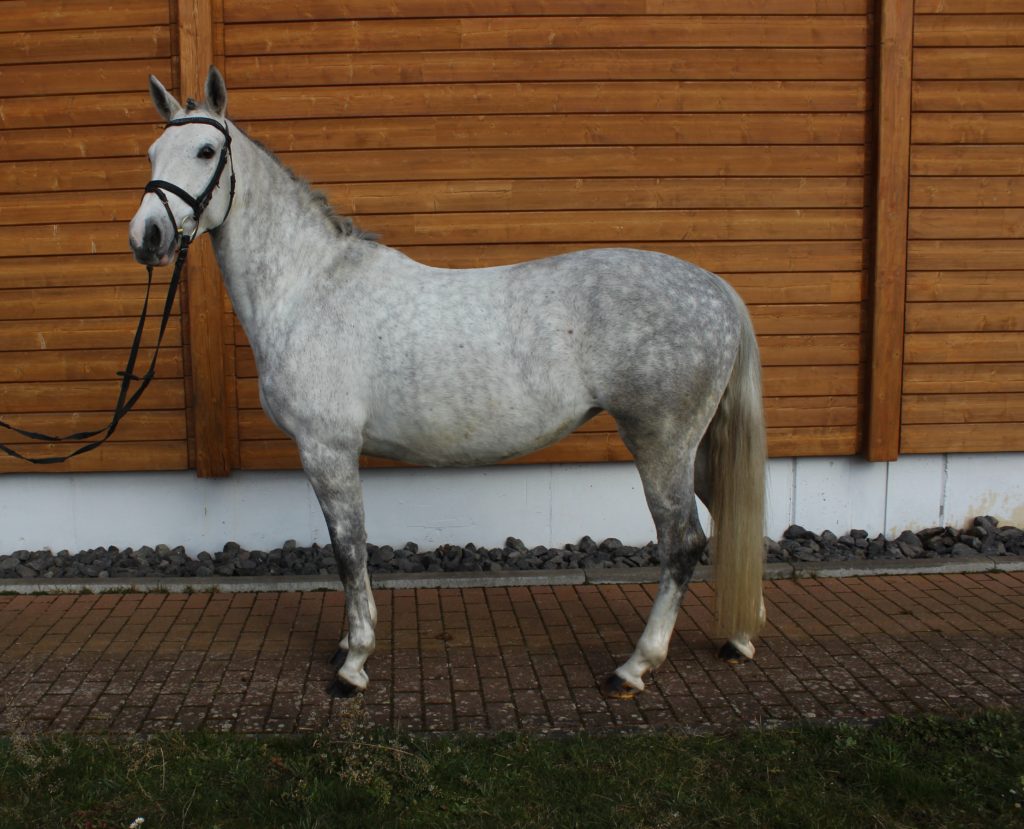 Sie ist eine hübsche Schimmelstute mit guten Grundgangarten. Bereits Eignungsprüfung gestartet ist sie nun fertig für DP-L. Durch ihre unkomplizierte Art ist sie sicherlich auch für jugendliche Reiter gut geeignet! Sie wurde bereits in der DR – A auf Turnier vorgestellt und befindet sich momentan auf L Niveau. Außerdem erweist sie sich als wunderbares Lehrpferd und macht auch am Sprung ein gutes Bild. Das sie unerschrocken im Gelände ist, rundet das Bild dieser feinen Stute ab.