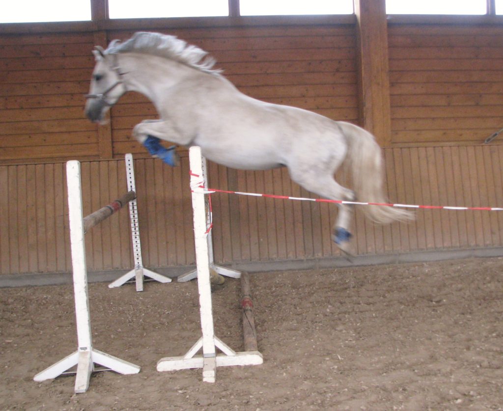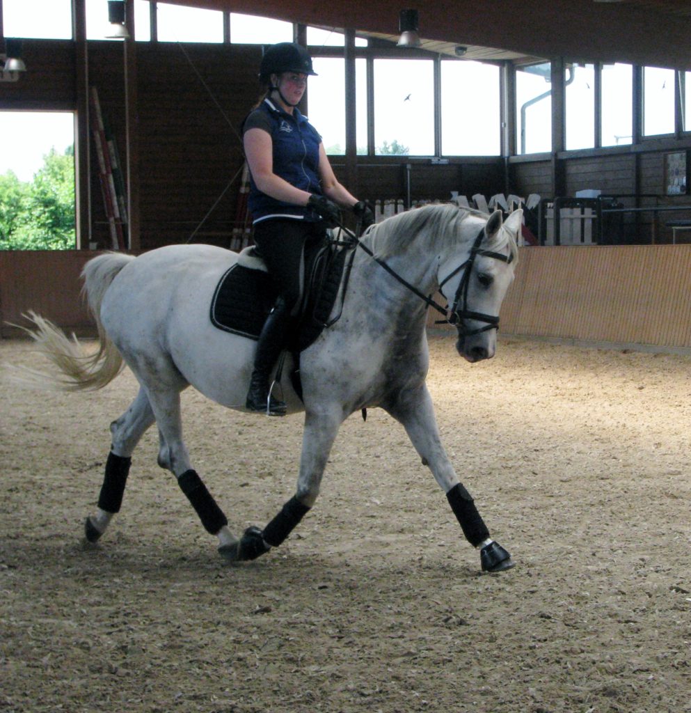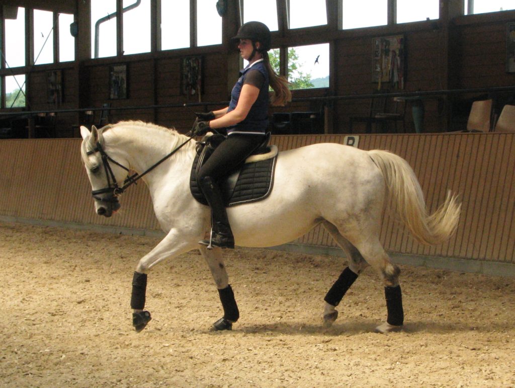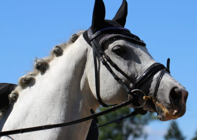 Sie ist eine hübsche Schimmelstute mit guten Grundgangarten. Bereits Eignungsprüfung gestartet ist sie nun fertig für DP-L. Durch ihre unkomplizierte Art ist sie sicherlich auch für jugendliche Reiter gut geeignet! Sie wurde bereits in der DR – A auf Turnier vorgestellt und befindet sich momentan auf L Niveau. Außerdem erweist sie sich als wunderbares Lehrpferd und macht auch am Sprung ein gutes Bild. Das sie unerschrocken im Gelände ist, rundet das Bild dieser feinen Stute ab.